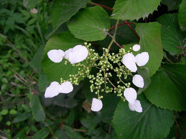 ★イワガラミ 千本松地区でイワガラミが咲いていました。イワガラミはユキノシタ科の植物で北海道、本州、四国、九州に分布します。山地に生える落葉つる性植物です。花は長さ1.5~3.5cm(装飾花)で白色です。開花時期は5~7月です。和名は岩絡み(いわがらみ)で、茎から気根(植物の地上部から生じて空気中に現れている根)をだして樹の幹や岩に絡みつくことに由来します。