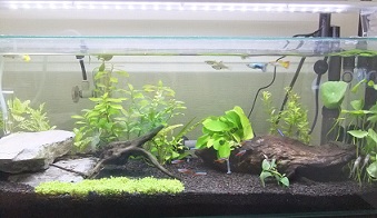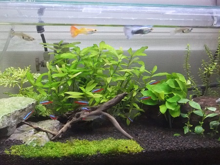 以前に・・・「子どもよりも親が夢中になっているメダカ水槽」を日記で紹介しましたが、 このメダカ水槽が昔から熱帯魚好きのパパのハートを呼び覚ましたようで・・・新しい水槽がリビングに増えました横幅は60cmこれから水草が成長すると雰囲気が変わってくるみたい 私は熱帯魚に詳しくないけれど、見ていると癒されますね 将来的にはもっと大きな水槽を・・・・と、男のロマン(?)は膨らんでいるようです
