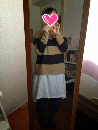 こんにちは~^^みんなは大掃除していますか~?うちは間に合わないので断念です。。。パパの休みも29からでその前にはゴミの日も終わっちゃっています~^^;わたしが出来るところだけって感じです。。。下手したらお正月掃除していそうな予感^^;とりあえず明日が燃えないゴミと資源ゴミの最終なのでまとめなくては~。。。これから郵便局で支払い関係をやってきます~。。。今日のコーデguで買った色違いのニット着てみました~^^これ、ほんと使えますよ~^^おすすめ!LINEで加工してみたのですがイマイチ~。使いこなせるように頑張ります^^;でもやっと携帯からPCに写真を送ってからの取り込み方が分かりました~って遅すぎ^^;*無印 カットソー*gu 太ボーダーニット*ソウルベリー Wガーゼワンピ*クロールアップ サルエルデニム*イルビゾンテ ソックスヘアバンドはブラントワールさん購入のものヘアゴムはホークカンパニーでした^^着用品【1点までメール便可】【リンネル ナチュリラ クシュフル 通販】★レビューを書いてメール便送料無料★ニュアンスがあってお洒落な大人ワンピ♪ふんわりWガーゼ7部袖ワンピースmaman styleさんにも入荷しましたね~^^il bisonte(イルビゾンテ):大きなブランドロゴが可愛い!【メール便可】il bisonte イルビゾンテ バッファローロゴパターン ソックス・5422306280(全2色)(unisex)【2012秋冬】[fs01gm]あったかガーリー・・・楽しむ冬のヘアアレンジ♪暖かなニット素材で女の子らしさUP♪森コーデとナチュかわさん必見!ハンドメイドアラン編みニットヘアーバンド/ターバン『メール便対応』『古着にも相性抜群♪大人可愛いヘアゴム』HAWK COMPANY h.t.c 【6506】 アンティーク調 コンチョ付き ヘアゴム【9色】 ■新品■ホークカンパニー【小物】【楽ギフ_包装】【最安】【古着MIX】【古着】【カンフル】【あす楽】わたしがしているのはハートのです^^気になる福袋たち楽天初登場★CALINERの2013年新春福袋限定20個新しい色の組み合わせで再登場♪【2013年新春★福袋】 4点★合計¥22365入りますCALINER/カリネ福袋¥5000 1月1日以降順次発送 メール便不可 同梱可 ナチュラル アメカジ アウター レディース 【fkbr-l】chou chou de mamanなどのお洋服など!!Happy 福袋 限定販売 【fkbr-l】ではでは~^^今日も読んでくださってありがとうございます^^また遊びに来てくれたら嬉しいなぁにほんブログ村にほんブログ村