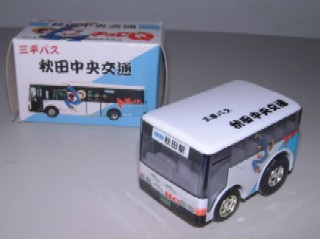 毎度お馴染み?チョロQシリーズです。皆さんの記憶からは忘れ去られていることでしょう・・・。なんせ、前回書いたが6月の末ですから・・・。今回は・・・9回目ですかね?秋田中央交通いきます。秋田に住んでいるからには、これを持っていなくては!ということで、秋田中央交通の「三平バス」です。やっと入手できました!実際にこの車両は、秋田中央交通の創業80周年を記念して、平成13年4月から運行されています。ボディはもちろん、車内のシートも「釣りキチ三平」一色のこのバスを見ていると、なんか楽しい気分になりますよね。そんなバスが、チョロQでも見事に再現されています。方向幕も、「城東消防 秋田駅」・・・完璧です!もうひとつ紹介させてください。今度はチョロQじゃありませんが・・・。バスの車内で、運転士名を掲示するプレートですね。現在走っているバスは、新しいものに交換されていますが、以前は、こういうものだったんですねぇ。これは、秋田中央交通の【秋田22い・784】に付いていたものということで、どんなバスだったのか調べてみたら、すでに廃車されている元都営の日野RJでした。バスの歴史を知る上で貴重な品ですね。今回掲載した2品は、先日、乗合倶楽部秋中支部さんから頂いたものです。秋中支部さん、ありがとうございました。大切にします。