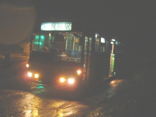 今日は、一日乗車券をフル活用して、秋田市内をバスで回っていました。新屋・浜田・名ヶ沢・御所野・日赤・・・と。午前中はそこそこ晴れていたので良かったのですが、午後からは時折強い雨が降ってくるという状態・・・。取材続行不可能ということで、秋田駅に戻るためにバスに乗ったら・・・そのドライバーさんは、先日も八戸まで一緒にバスの撮影に行った知り合いの運転士さんでした!これも何かの縁ということで、本日のラストラン(?)船場町経由割山線を往復御一緒させていただきました。祝日の夜ということもあって、普段よりはお客さんは少な目ということでした。全部で5人くらいでしたかね?さらに、秋田駅に戻る便では、終点秋田駅到着の直前まで誰も乗ってきませんでしたし・・・。それでも、1人1人のお客さんに気を配り、的確にマイクで案内をする運転士さんは他にはなかなかいませんよね。素晴らしいと思います。私以外にお客さんがいなくなると、ここは秋田のはずなのに、八戸のバスの情報なんかも飛び交う不思議な空間に・・・?雷も鳴っているような悪天候の中、お付き合い頂きありがとうございました。そしてお疲れ様でした。夜の車庫って・・・なんか神秘的!?