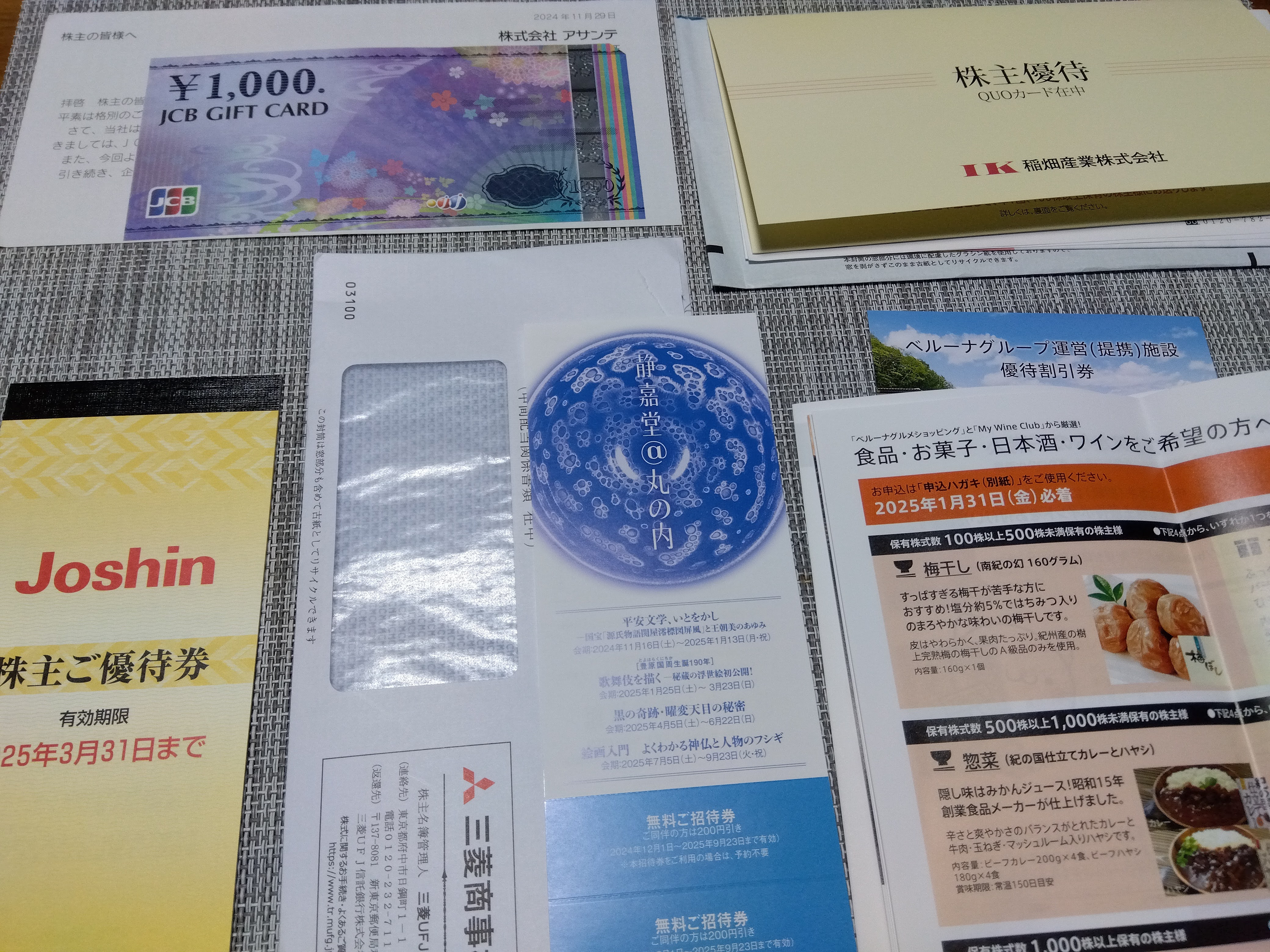 株主向けの通知が沢山届きます。記録まで・Joshin(単元株未満、1株のみ、買い物割引券)・三菱商事(単元株未満、美術館入園無料)・アサンテ(1,000円ギフトカード)・稲畑産業(1,000円クオカード、1000株2年目、妻名義)・ベルーナ(梅干しを選択、私・妻2名義)Joshinは何買おうかなぁ、去年分はGoProでほとんど消費したけど外付けHDが容量も寿命も限界なので、大容量のを買おうとは思っていますが、それでも幾分か余るでしょうし(5万円購入分まで、10%引き。5000円分の割引券がもらえます)この中で会心の買いだった稲畑産業購入時2300円台で、今もPER9くらいなんだけど、当時どれくらいだったのだろうEPSが良い割に株安だったので購入した記憶だけある株買うときはEPSは絶対確認しなきゃね