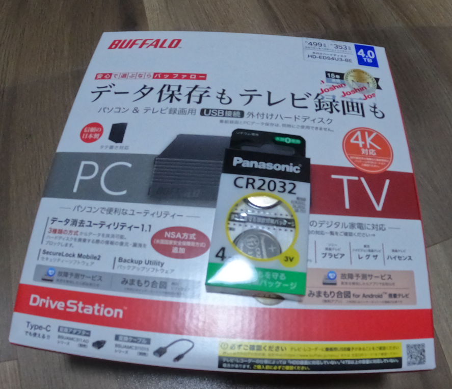 【株主優待】241203到着分 Joshin(単元株未満、1株のみ、買い物割引券)Joshinの優待で購入した家電の紹介https://www.buffalo.jp/product/detail/hd-eds4u3-be.html+金額調整の為の電池購入(株主優待券は2000円ごとに適用)ハードディスクは本体価格13,178円ネットで見ていたのは4TB 15,000円台だったので、恐らく型落ち更にアプリ割引で5%オフ株主優待券込みで 11,319円のお買い上げ私にとって1TBの外付けHDでしのいでいましたが、いい加減使用感が悪くなって(整理も大切なのですが、要は容量がパンパンに)4TBの大容量のHDを購入した背景容量が大きくなる原因はGoPRO月1回くらい使う人で、昨年2月購入後、300GBくらいは使用した感じです尚、株主優待券は7枚使用予定でしたが、大幅な割引による6枚しか使用できませんでした。。。