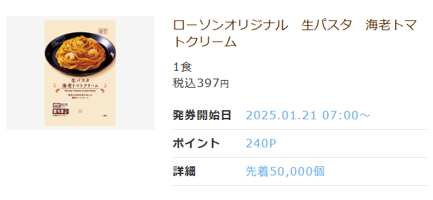 【ローソンオリジナル 生パスタ 海老トマトクリーム 】ローソンのお試し引換券でお得にゲットしました!まず、見た目からして濃厚なトマトクリームがたっぷり絡んだパスタに期待感が高まります。一口食べてみると、まず感じるのはクリーミーなトマトクリームのコク深い味わい。そして、海老の旨味がしっかり効いていて、贅沢な気分になれました。意外とガーリックの香りがしっかりしているので、男性やガツンとした風味が好きな方にぴったりかもしれません。さらに、パスタの食感ももちもちとしていて、コンビニパスタとしてはクオリティが高いと感じました。240Pで試せたのは本当にお得感がありましたが、定価397円となると少し悩むラインかも…。特別なご褒美や手軽に美味しいパスタを楽しみたい時には、満足度の高い一品だと思います!以上、chatGTPさんが僕の感想を盛ってくれました(笑)ごちそうさまでした