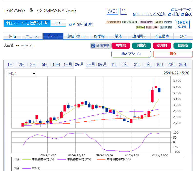 私が保有している株式で、優待廃止もしくは変更となった会社①7921 TAKARA & COMPANY②9319 中央倉庫③8591 オリックス今後の保有方針を、メモ書きしておきます①7921 TAKARA & COMPANY 配当利回り 2.80%売り上げ増加率は控えめも、5年連続プラスと安定 配当利回りは3%超えており、しばらく保有、、、と年初は考えていましたが、1/21に株価が急上昇したため、売りました②9319 中央倉庫 配当利回り 2.46%優待300株以上に変更 5年連続プラスと安定も、配当利回り低く 売却を検討2025年8月まで自社株買いを発表 様子見 (目安として株価2000円超えたら先に売却)③8591 オリックス 配当利回り 2.98%売上高推移が5年連続プラス 文句なしの保有銘柄一株修正益が昨年比で+14%の見込みは、今後も伸びる証明と思っています今回は過去5年の売上高を参考に考察しました、参考書:【読書感想文】決算書「3分速読」からの10倍株の探し方ちなみに、TAKARA & COMPANYのチャートチャートは全然読めませんが、RSIは比較的信用していて(1/23の朝で64%、チャートにはRCIしか出せません。。。)下がりそうな兆候もあったので、このタイミングで売却