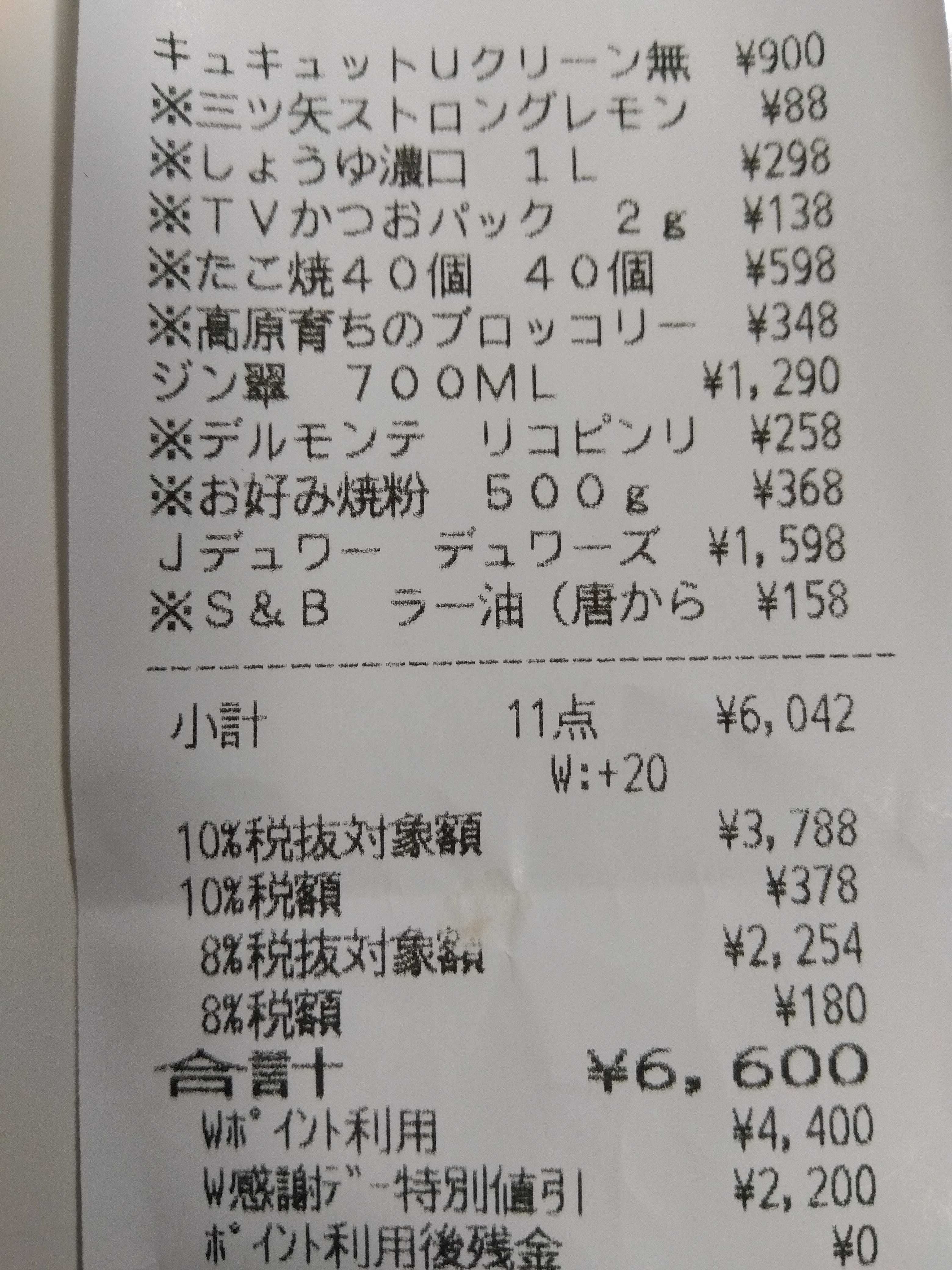 福寿、デュワーズ冷食(たこ焼き、チャーハン、唐揚げ)他食品(牛乳、ワサビ、醤油)日用品(今回はコロコロの予備)以上5,380円+税 すべてWAON POINTでのお支払い