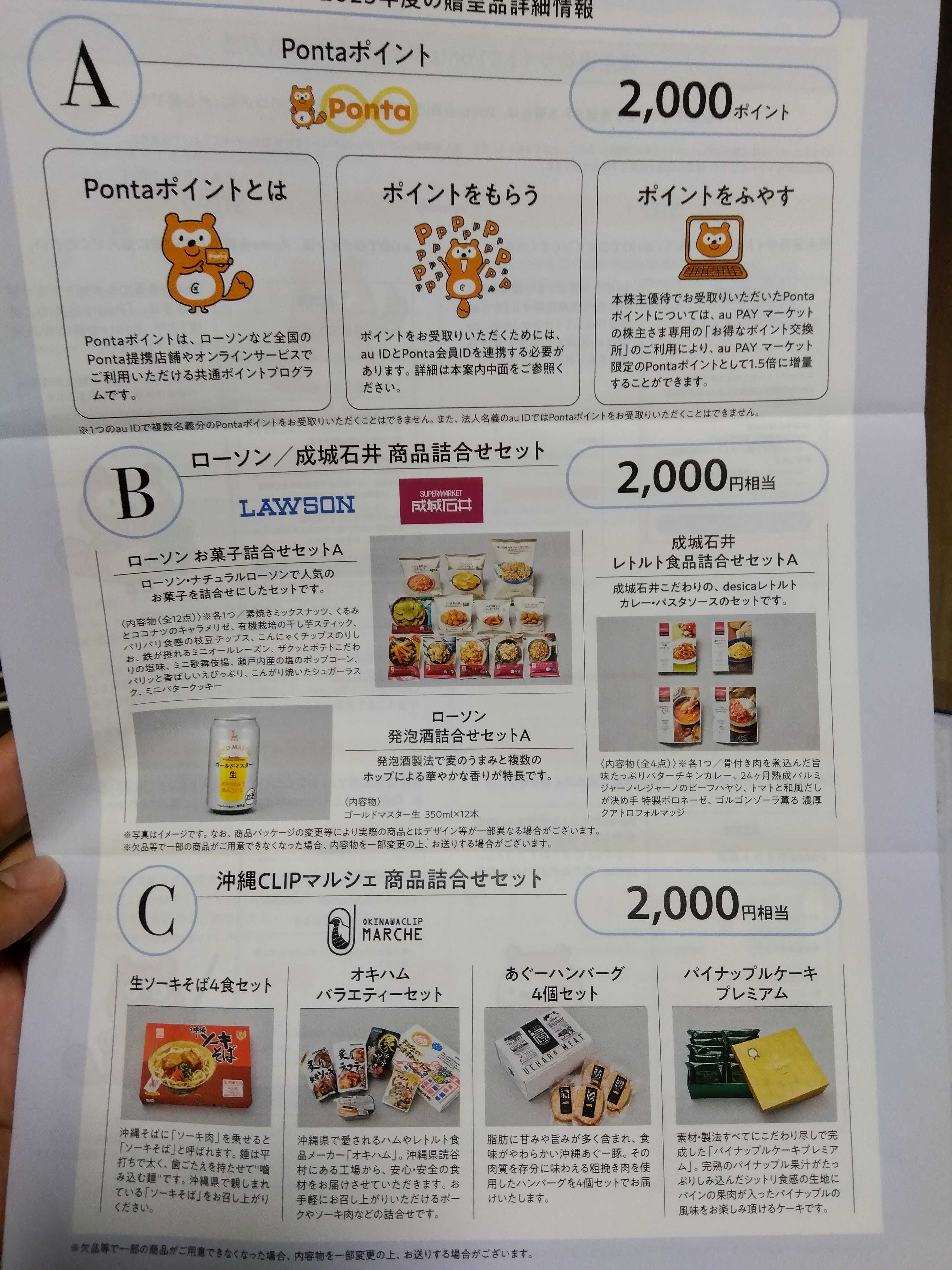 いずれもカタログギフトからポンタポイントに変更予定でしたが、、、ローソン・成城石井の商品詰め合わせも贈呈品としてピックアップされていました特に成城石井は、割と良さそうKDDI 3000円分、沖縄セルラー2000円分 なので、すこしずつ優待は違いますが沖縄セルラー:成城石井レトルト商品セットKDDI:成城石井ワインセット にしました沖縄セルラーはグレード上がったら沖縄マルシェもどうなるか楽しみですね