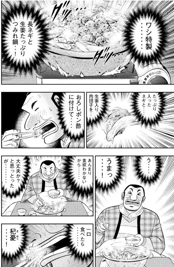 正月から風邪をひきました(年越し前に妻が体調崩してたのを移された)そんな中思い出した料理1日外出録ハンチョウ 第9話より(ハンチョウも風邪ひきかけ)漫画内では、レシピは出てきませんので個人的にアレンジが必要ですクラシル:鶏団子の生姜スープ<鶏団子>鶏ひき肉 300g生姜 20g長ネギ 10cmしょうゆ 大さじ1料理酒 大さじ1片栗粉 大さじ1→スープを入れて煮立ってから入れる<具材>長ネギ のこり豆腐 1丁えのき 1袋小松菜 1袋玉ねぎ 1個→豆腐以外の具材はごま油 大さじ1 で先に焼いてみましたが、結構良い<スープ>水 400ml(A)鶏ガラスープの素 大さじ1(A)こしょう 適量(A)塩 少々生姜効いててで旨かった本編と違って、スープに味つけちゃったので味ぽんは不要ですごちそうさまでした