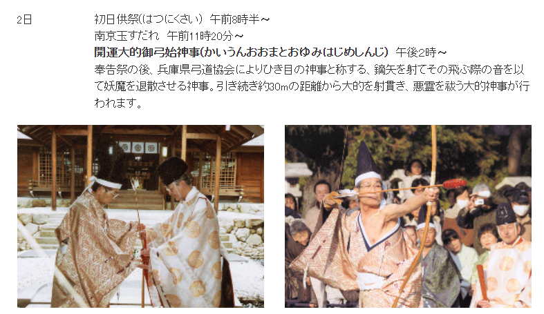 1月2日は廣田神社へ初詣に行ってきましたちょうどタイミングよく、14時からのイベントに間に合ったので見学させてもらいました引用:廣田神社 1月の行事この日は快晴、引き手は神主さんだけでなく、地元の弓道部の方も参加していました(大学生か高校生は不明)写真はありませんが、的を射抜くわけではなく、広げられた風呂敷に矢を打ち込むのをイメージしてください。HP記載には大的とありますが、的のイメージは異なります射るときに魔除けの音がきれいになり、厄落としになったでしょうか本年もよいお年を