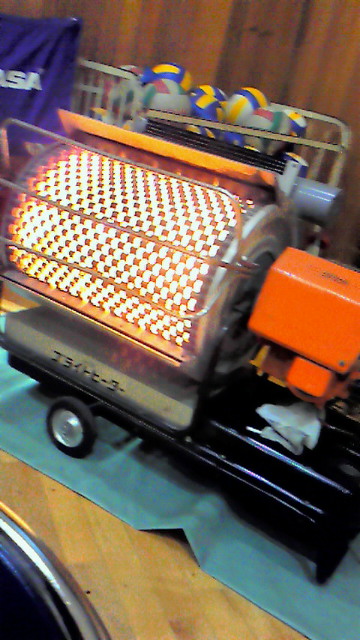 朝からダンス 今日は朝から体育館でダンスの練習です。ダンスをしているお姉さんたちは、汗だくです。寒いので体育館の中ではジェットヒーターをバンバン焚いています。6時間も焚いていると20リットルも灯油が終わってしまいます。でもやっぱり外では、陽が当たって五度位になっているのに…中は寒くてたまりませんよ。(私は見てるだけなので)ただ…ズット。ジェットヒーターの前にいたら髪の毛がパサパサになってしまいました。