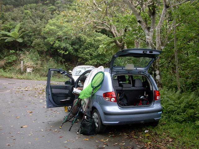 ちゃっちゃとレンタカーを借りて取り合えず於茂登岳に行くことにした。まず有名なムネモンウスアオカミキリの採れる木(俗に御神木と呼ぶ)まで登山道を登る。やたら寒い三重から夏日の石垣に来たせいか、以上に汗をかいた。去年もこの時期に石垣に来たが、去年は特別に寒い年だったらしい。10分くらいで1本目の御神木に着く、が、枯れてた。ここはあきらめて2本目の御神木に向かう。しかし採れない。ムネモンウスアオは厳しい。1本目まで下ってイワサキキンスジカミキリを採集。去年も採ったけど。