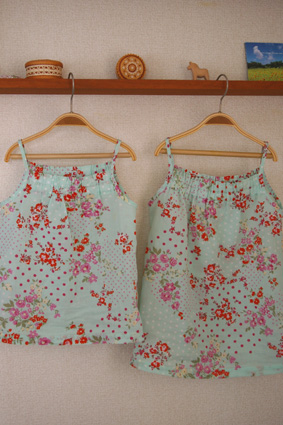 ねえね(120サイズ)とチビ(90)に、ギャザーキャミソールを作りました。パターンはこちらから。まいにち着る女の子服お宮参り前日になんとかベビードレスを完成させました。久しぶりのミシンは楽しい~♪勢いに乗って、ギャザーキャミは二人分いっぺんに作成。HARUのこの生地、さらさらでとっても涼しげ。もっと早く縫いたかったけど、ま、この夏は仕方ない。こんどはニットが縫いたくなって、まだ暑い日もあるし~と、さらに夏物縫ってます。チビのがまだ作成中なので、お披露目はまた後日。