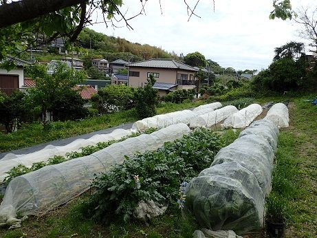 おはようございます。神奈川県”中高年ホームファーマー3年生”による今年度最後の実習レポートです!そして~次なる目標は、本格的な耕作を目指す「サポーター」としてキャリアアップに挑戦する1年となります。☆~のほほん農園~☆(仮:葉山野菜研究場) <第1のコース>:手前左下からキュウリ苗の植え付け地<第2のコース>:手前左下から>春ジャガイモ×ブロッコリー&カリフラワー苗植え付け地<第3のコース>:手前左下から春ダイコン&春夏キャベツ(みさき)<第4のコース>:中央下から初春ブロッコリー跡地<第5のコース>:中央下からズッキーニ苗の植え付け地×トマト(大玉・アイコなど)<第6のコース>:左手奥下からピーマン×ナス(長ナス)<第7のコース>:左手奥下からカボチャ苗植え付け地<第8のコース>:左手奥下2番目から長ネギ苗植え付け地&ニンニク球植え付け地<第9のコース>:左手奥下から>サトイモ×サトイモ☆~本日の作業内容~☆前回は自家製メロン苗の植え付け作業を行いましたが、今回は・・?!<ジャガイモの芽かき&追肥>⇒春ジャガイモを植え付けたのは、ちょっと遅めの3月下旬頃。大きなイモを収穫するために、草丈が15~20センチほどの高さになった頃、種イモ1個に対し大きな芽を1~2本残し残りの芽はすべて、地際から引き抜くか、ハサミなどで切りとりました。<春夏ダイコン>さすがは「晩抽性」の品種の大根です!とう立ちが遅いのが魅力☆<草取り>⇒ニンニクの畝の周りにたくさんの雑草が・・(*ノω<*) アチャー さすがにココは草刈り機はかけられないので、丁寧に手や鎌を使って引き抜きました。地味な作業だけど・・・これも大切な作業の1つですね☆☆~本日の収穫野菜~☆気が付けば・・・夏野菜のほとんどの植え付けを終了しているため、これといった重要な作業がありませんね。。残すは、ニンニク、大根、キャベツの全撤去して、新たな夏野菜をお迎えしたいなぁ~♪次・・何しよう?「頑張って、野菜つくれよっ」と応援していただける皆様、ランキングに参加しています。ポチっとクリックをおねがいします。いつも皆様の応援に感謝しております。毎日のブログ更新の励みとなっています人気ブログランキングにほんブログ村レシピブログのランキングに参加中♪ よろしければクリックしてくださいね♪
