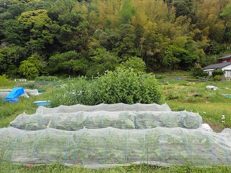 おはようございます。神奈川県”中高年ホームファーマー3年生”による今年度最後の実習レポートです!沖縄気象台は5月16日、沖縄地方が梅雨入り したとみられると発表した。平年より7日遅く、 昨年より16日早い。14日に梅雨入りした奄美地方に続いて全国2番目!(沖縄タイムス+プラス ニュース より)(*ノω<*) アチャー とうとう・・梅雨入り前線が気になる頃となるのでしょうか?そろそろ長雨の季節が近づいてくるのかな?って思うと気が重たいですが~貴重な晴れ間を今のうちに有効活用したいですね☆☆~のほほん農園~☆(仮:葉山野菜研究場) <第1のコース>:手前左下からキュウリ苗の植え付け地 <第2のコース>:手前左下から>春ジャガイモ×ブロッコリー&カリフラワー苗植え付け地 <第3のコース>:手前左下から春ダイコン&春夏キャベツ(みさき)<第4のコース>:中央下からメロン苗植え付け地<第5のコース>:中央下からズッキーニ&ホウレンソウ×トマト(大玉・アイコなど) <第6のコース>:左手奥下からピーマン×ナス(長ナス) <第7のコース>:左手奥下からカボチャ苗植え付け地 <第8のコース>:左手奥下2番目から長ネギ苗植え付け地&ニンニク球植え付け地<第9のコース>:左手奥下から>サトイモ×サトイモ☆~本日の作業内容~☆前回はトマトの支柱立て&カボチャのネット外し作業を行いましたが・・今回は?!<ナスの支柱立てをしよう>⇒ナス苗を植え付けたのは4月下旬頃。<作業1.追肥> 植え付けから2週間後、追肥をスタートします。ナスは栽培期間が長いので定期的に追肥するのを心掛けます。ナスのコンパニオンプランツの相手に選んだのは~つるなしインゲン。無事に発芽したようです♪<作業2.仮支柱から本支柱へ>苗から10センチ外側に支柱を立てて ナスの茎に麻ひもをかけて支柱に結び付けました。<作業3.わき芽摘み> 一番花が着く頃になるとわき芽が伸びて枝葉が混み合ってきます。 一番花の下のわき芽を3つ残して、すべて摘みとりました。<ピーマンの支柱たてをしよう>⇒ピーマン苗を植え付けたのは、4月下旬頃連日の夏日で少々グッタリ水切れ中かな?葉がしんなり~(^_^;)<作業1.支柱たて>仮支柱から本支柱へ差し替え、株のわきに長さ120センチの支柱をたてました。苗の茎にひもをかけ、2~3回ひねって支柱に結び付け誘引する。<作業2.わき芽かき> 生長すると葉の脇よりわき芽(側枝)が伸びてきます。 最初の花(1番花)の下のわき芽は全て摘み取ります。株を大きくするため、生育初期はわき芽が小さいうちにこまめに摘むことが大事!<草刈りをしよう>⇒つい・・この間草刈り、したばかりなのに~あっという間に再び雑草が・・!!仕方がないので、境界線のところまで草刈りをしてもらいました。☆~本日の収穫野菜~☆ズッキーニのコンパニオンプランツの1つで栽培しているホウレンソウ~。支柱を立てたいけど・・葉物野菜の収穫が終わらないと安心して支柱がたてられない!急いで・・ホウレンソウ消費しなくっちゃ♪っと頑張って食べる分ずつ収穫しているのですが~間に合うかな?とう立ちしませんように(笑)「頑張って、野菜つくれよっ」と応援していただける皆様、ランキングに参加しています。ポチっとクリックをおねがいします。いつも皆様の応援に感謝しております。毎日のブログ更新の励みとなっています人気ブログランキングにほんブログ村レシピブログのランキングに参加中♪ よろしければクリックしてくださいね♪