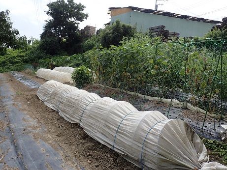 おはようございます。神奈川県”中高年ホームファーマー3年生”による今年度最後の実習レポートです!☆~のほほん農園~☆(仮:葉山野菜研究場) <第1のコース>:手前左下から第1弾キュウリ & ゴーヤ お片付け&つるなしインゲンお片付け<第2のコース>:手前左下から>秋キュウリ × 秋トマト <第3のコース>:手前左下からサツマイモ × 第2弾サツマイモ<第4のコース>:中央下からメロンお片付け & つるなしインゲンお片付け<第5のコース>:中央下からズッキーニお片付け地 × 秋冬ダイコン種まき地<第6のコース>:左手奥下からピーマン × ナス(長ナス)&つるなしインゲン終了 <第7のコース>:左手奥下からカボチャお片付け地 × ニンジンお片づけ地 <第8のコース>:左手奥下2番目から第1弾長ネギ × 第2弾長ネギ × 第3弾サトイモ<第9のコース>:左手奥下からサトイモ × サトイモ☆~本日の作業内容~☆前回は、ブロッコリー&パクチーのコンパニオンプランツをスタートさせましたが、さて今回は~?<ダイコンの間引きをしよう~>秋冬採りダイコンの種まきをしたのは、8月下旬頃残暑が厳しい中でも、どうやら無事に発芽してくれたようです。⇒防虫ネットを外し・・不織布を剥がしてみると~ほらっ♪可愛い~ダイコンの葉っぱが・・☆(o'艸')クスッ<ダイコンの間引きのタイミング>*1回目の間引きの時期*双葉が展開したころに~3本に間引き、周囲の土を除草しながら、土寄せをする。*2回目の間引きの時期*本葉2~3枚になったら、2本に間引きし、土寄せをする。*3回目の間引きの時期*本葉が5~6枚になったら、1本に間引きし、一握り程の肥料を施して周囲の土とよく混ぜながら土寄せをする。⇒(^_^;)・・第1回目の間引きを過ぎてしまっていたようなので・・一気に3本に間引きをしました。*秋栽培は台風の時期と重なるので、苗が風で振り回されないようしっかりと土寄せしたあと、防虫ネットもしっかりと止めました。<サツマイモのツル返しをしてみよう>⇒再び~畝間が分からないほど、サツマイモのツルがはびこっていたのでツル返しをしました。☆~本日の収穫野菜~☆昨日夜(9月2日午後7時ごろ)、神奈川県横浜では集中的なゲリラ豪雨があり横浜駅が雨漏り水浸や停電が各地でありました。カミナリもすごくて~本当に怖かったです。今週は、たくさんの台風や台風の卵が日本へやってくるのかと?不安な日が続きそうです。。「頑張って、野菜つくれよっ」と応援していただける皆様、ランキングに参加しています。ポチっとクリックをおねがいします。いつも皆様の応援に感謝しております。毎日のブログ更新の励みとなっています人気ブログランキングにほんブログ村レシピブログのランキングに参加中♪ よろしければクリックしてくださいね♪