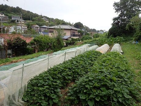 おはようございます。神奈川県”中高年ホームファーマー3年生”による今年度最後の実習レポートです!☆~葉山農園風景~☆<秋ジャガイモ種芋の植え付け地><ナス苗植え付け地 & 第2弾ナス苗植え付け地><ハクサイ&ラッキョウ ×ダイコン種まき地><キャベツ苗植え付け地 × 芽キャベツ苗の植え付け地><第2弾ブロッコリー苗植え付け地 × 第1弾ブロッコリー苗植え付け地><オクラ × 第2弾ズッキーニ苗植え付け地><秋キュウリお片付け地 × 初秋トウモロコシお片付け地><メロン・スイカ跡地 × カリフラワー苗 × ニンニク × 第2弾オクラ> <キクイモ × 菊芋>☆~本日の作業風景~☆前回は、ニンニク種球の植え付け作業を行いましたが、さて今回は~?<ニンニク被害が発生~!>Σ(T▽T;) ぐわわぁぁ~ん!前回、約2時間ほどかけて~地味に植え付けたニンニクの種球がほぼすべて?掘り出されていました!犯人は誰だ~?!カラスかな?⇒悔しい気持ちをぐっと抑え?再び・・掘り出さたニンニク種球を植穴に押し込みました。その後、防虫ネットを被せておきました。<草刈りをしてもらお~!>前回は耕運機部長さんでしたが、今回は草刈り部長さんになって作業をしていただきました(o'艸')クスッ<マルチをかけ直そう~?!>⇒先日、耕運機部長さんが耕運機をかけ、マルチまで張ってくれたのに、強風で?無残にもマルチが剥がれてしまった畝を再び、マルチを丁寧に張り直しました。。すべて手作業(クワ)でやったので、疲れたぁ~。゚(。>ω<。)゚。ピー<カブ&シュンギク混植>カブの混稙栽培とは、コンパニオンプランツのこと。カブ(蕪)はアブラナ科。アブラナ科を好んでやってくる「モンシロチョウ」や「コナガ」の幼虫が寄生して葉を食害します。そのため、これらの害虫が嫌うキク科の野菜(シュンギク、レタスなど)やセリ科の野菜(パセリやニンジンなど)を近くに植えることで、害虫がつくのを防ぐ効果があります。⇒今回は「カブ(アブラナ科)×シュンギク(キク科)」を選び種まき後、不織布を敷いて~防虫ネットをかけて作業終了です。<草刈り後・・>草刈り部長さんのおかげで~すっかり綺麗になりました♪(= ̄▽ ̄=)V やったね☆☆~本日の収穫野菜~☆元台風18号の影響で神奈川県でも今朝ゲリラ豪雨のような激しい大雨が!怖かったあ~。。クリック頂けると毎日のブログ更新の励みになります♪人気ブログランキングにほんブログ村レシピブログのランキングに参加中♪ よろしければクリックしてくださいね♪