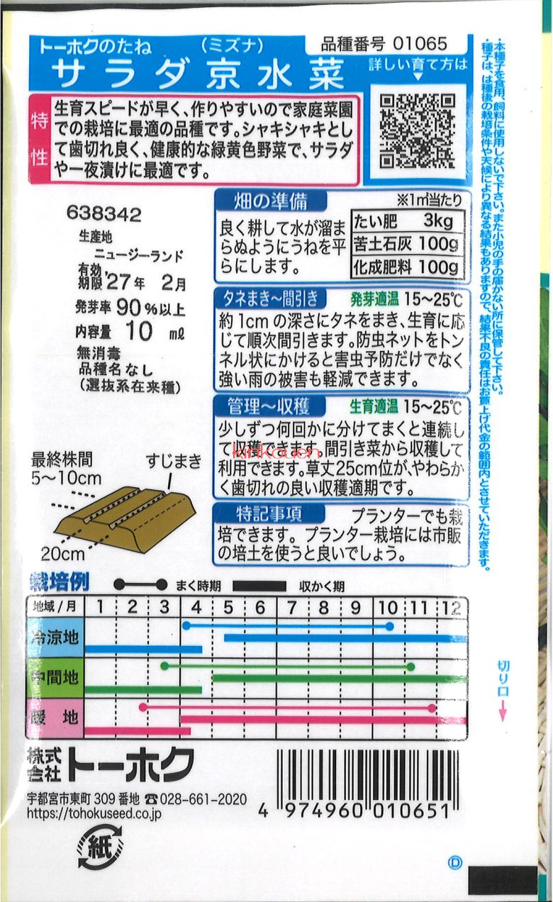 草丈20センチ以上になったら、中株のサラダ水菜として収穫が可能。