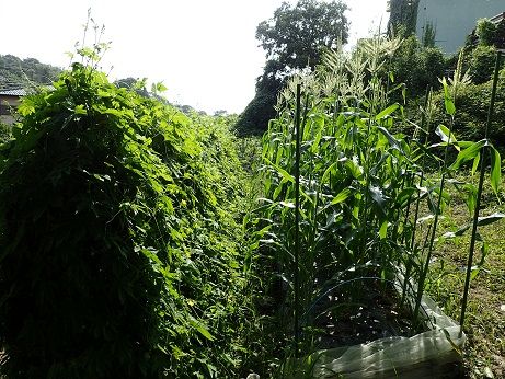 平さやインゲン&ゴーヤ苗の植え付け地 × トウモロコシ種まき
