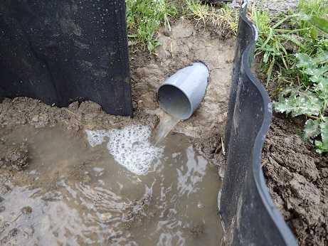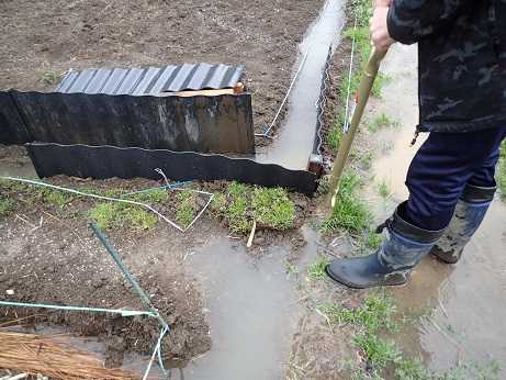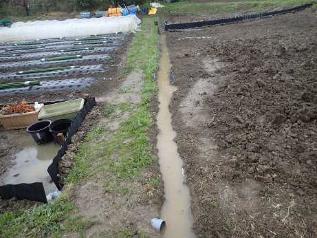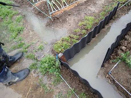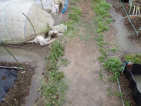 (ワケギ × ソラマメ)の畝間には~大量の雨水が流れ込んでいました。