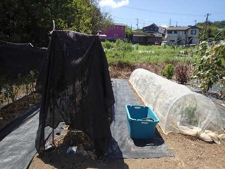 ​<ナスの遮光ネットを外そう(台風対策)>​