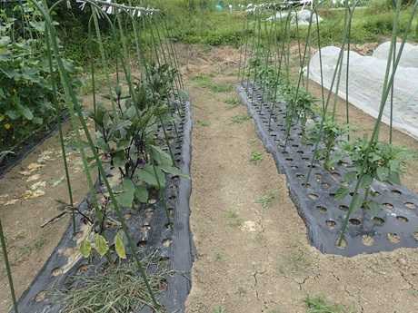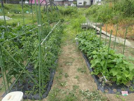 (第2弾トマト苗植え付け地 × つるなしインゲン種まき地 )