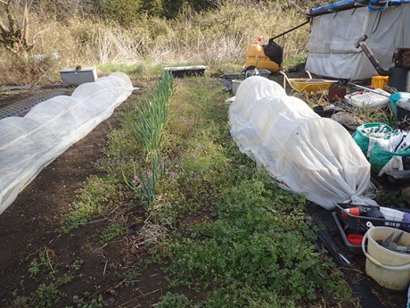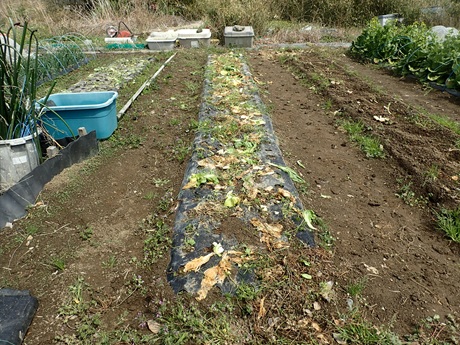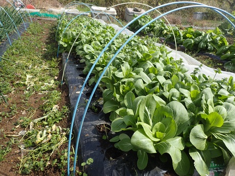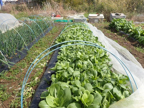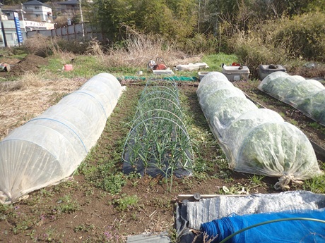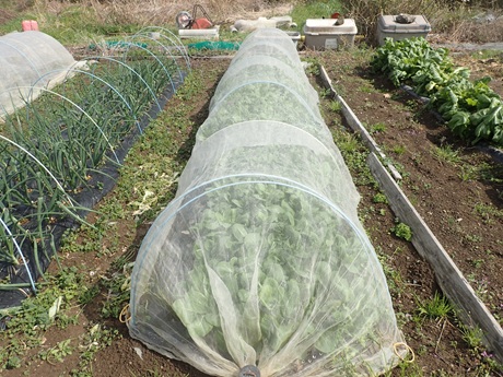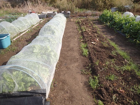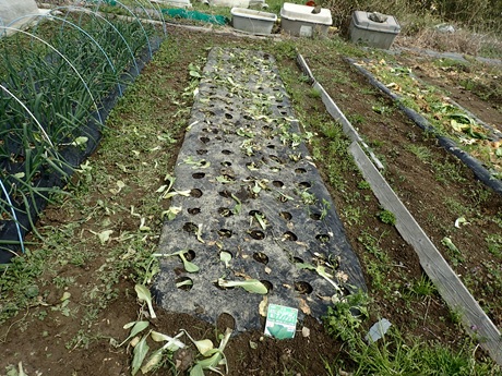(カボチャ種まき地 × タマネギ苗 × 春採りチンゲンサイ種まき地)