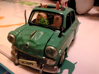 りょうちゃんのコレクション。半ば、旦那も絡んでるのですが…。ウサビッチは一昨年の冬にたまたまYouTubeで見つけたの。クレイアニメとか面白いなぁ、と旦那が検索してる中で見つけた。ホント、ウチじゃテレビって見ないし、ましてや有料放送なんてとんでもない。BSだの、スカパーだの、無縁な家なんですが。MTVでやってたらしいですね。ケーブルテレビなんかで見れたのかな。ま、とにかく、ウサビッチには昨年2月のりょうちゃんにとっては救いの神?実家に預けてたときに、過酷な毎日の中で、たまに私の弟に相手してもらって、パソコンでウサビッチ見せてもらってたりしたし、そうちゃんが生まれるときにも、病院にパソコン持ち込んで、授乳時間なんかはウサビッチ見て、部屋で一人待っててもらったりしました。そんなウサビッチがこの頃、ゲームセンターに現れ始めました。りょうちゃんとそれをたまたま見つけた時はコーフンして、旦那に話をしてましたね。ゲーセンで見つける前に、ヴィレッジバンガードでりょうちゃんが買ってもらったのがコレ。昨年12月に、旦那の大阪出張に合わせて、ついでにルミナリエ行こうッって時に、待ち合わせ場所で買ってもらったの。りょうちゃんは嬉しくってッいい顔してました。・・・あれ?いま、どこにあるんだろう…。だいぶハゲてきちゃってますね。塗装が。今は義父母のところへ行くたびに従兄弟が昔使ってたプルバックカーを持って帰ってきてるので、ウサビッチのプルバックカーはなんだか忘れられてます。でも、旦那は傷ついてくのがちょっと残念そうだったので、ちょうどよいかと・・・。テレビの上に飾っておきます…。出来よすぎ!ウサビッチ プルバックカー 逃亡者のプーチン・キレネンコたち結構なお値段ですよっっ。