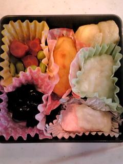 そうちゃん用に作ったお節です。凍ってたおかゆ。旦那が黒豆を義母からもらってきたので、戻して、圧力なべで炊いたのね、それをそうちゃん用に砂糖控え目で。筑前煮から取り分けて、ニンジンをさらに柔らかく枝豆と一緒に炊いたの。出し巻き卵は大人と一緒。サーモンのクリームソースがけ。スイートポテト。はい。そうちゃんは正月は突発性発疹の真っただ中。知らない家へ行ったのもあり、食べたのはほんの3口ほど。いいんです。いいんだよ、かっかは。作り上げた時点で完全に燃焼しちゃってるから。自己満足だよ。うん。designed by ayu-maya