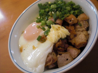 先日の昼ごはんですが…焼鳥丼。温泉卵がいい感じです。やる気があるときはこんな昼ごはんをすることもありますが、温泉卵だなんて…晩ごはんにもいいと思うなぁ。丼はガツガツっとかきこめるので、ちょっとオツカレな時にもいいですよね。ちなみに・・・今日の晩ご飯は「ポークチャップ」でございます。おいしいよ。玉ねぎすりおろしとニンニクすりおろしとケチャップとウスターソースとお酒に漬けこんでから焼くの。コチラをいつも参考にさせてもらってます。 シェフに褒められた♪母のポークチャップ by 874さらに玉ねぎなんかも一緒に炒めてボリュームアップ。・・・そうちゃんには何食べさそうか…。今日はないなぁ…。軽く卵炒めてポークチャップのたれを絡めるか。つけあわせは白菜サラダです☆野菜高いからなぁ…。毎晩御苦労さまです。子供たちとお風呂に入ってからとっかかります。