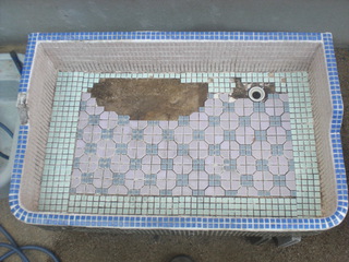 私のおばあちゃんのウチから流し?パン?を発掘してきました。タイル張りのコンクリート製のものです。昭和初期のものだろうと母は言ってます。「ほんなん、お母さんが生まれる前からあったヤツやで?」だそうです。使われなくなって、ばぁちゃんちの裏庭に植木鉢みたいになって置いてありました。土を掘り出し、洗って、持って帰ってきました。めっちゃ重たい!!旦那の協力なしでは車にも積めませんでした。頑張って洗って、目地も古いのを削って落としました。古いのでタイルのないところもあるし、ガタガタ。外構工事の時に使ったタイルの残りをもらっておいたので、それで適当に修復しようと思います。センスないし、あるものでなんとかしようと思うので、多少思い通りにいかなくてもまぁよしとしよう。うまくいくかしらん。