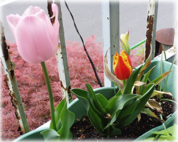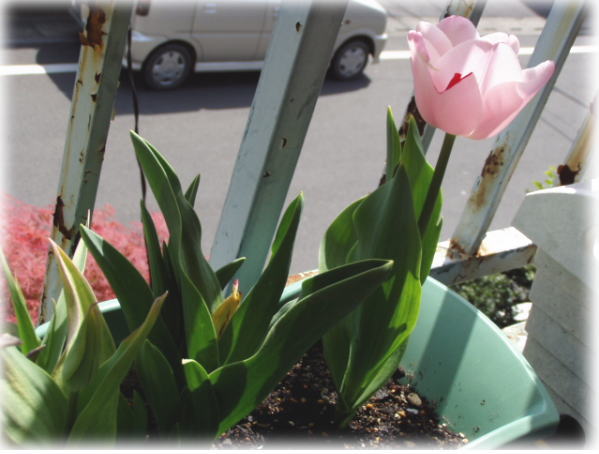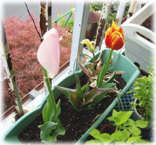 今日から5月!世間はゴールデンウイーク真っ只中で出掛けている家が多いのか、近所はいつもより静かです。夕べから風邪薬を飲んで今は鼻と具合悪さは少し落ち着いてきました。昨日、家に帰ってみると1番先に咲いたピンクのチューリップの花びらが落ちていました。花びらはまだ綺麗なので拾ってとっておきました。ユリ咲きタイプはこれで満開状態なのでしょうか。中途半端な開き方です。葉の色も悪いので失敗しちゃったかな。明日、身体の調子が良かったら学芸大学駅近くのライヴハウスでやる旦那のライヴに出掛けようと思っています
