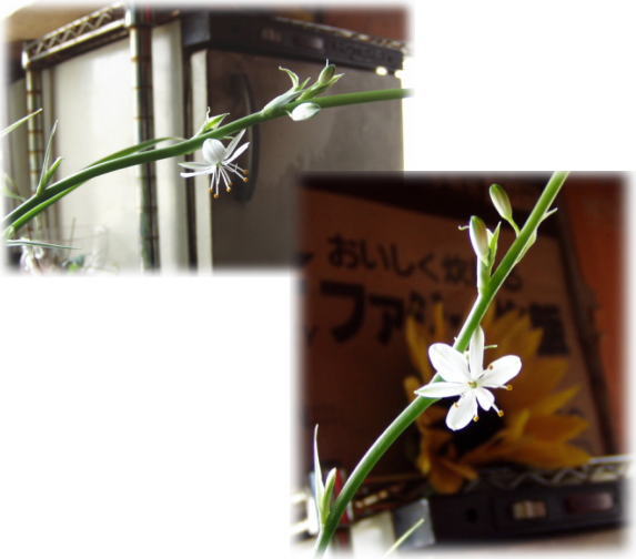今日は朝倉庫に歩きで来ました。まだ9時前で暑くもなく清清しい空気が気持ち良かったです♪気持ちが良いといえば江戸川の土手を歩くのもとっても良い。でも数回しか行ったことがなく、前回行ったのは去年の夏前だったかなー近くの所っていつでも行けると思うからか行ったこと無い所が多い。東京生まれの人が東京タワーに行ったことが無いのと似てるかな(笑)この時期めまぐるしく植物の成長が著しい。昨日ベランダの植物にお水をあげてなくって、今日水やりした時チューリップが1本ギューーンと伸びていた。1日見ないだけでこんなにも伸びていたなんて!あと、まだ芽が出ないなーと思っていた茗荷も1つ芽が出ていた。今年はまだ、本格的な土いじりをしていないので早く土を買ってこないとなーそして倉庫に着いてみるとオリズルランの花が咲いていた!か~わ~いぃ~最近ランナーが伸びてきていて、蕾もついてきたのでいつ咲くのか楽しみだったんだー♪あとがきこれ打ってる最中固まって再起動。あ゛ーーー って思ったけど、文章が残っててよがったー(嬉泣)