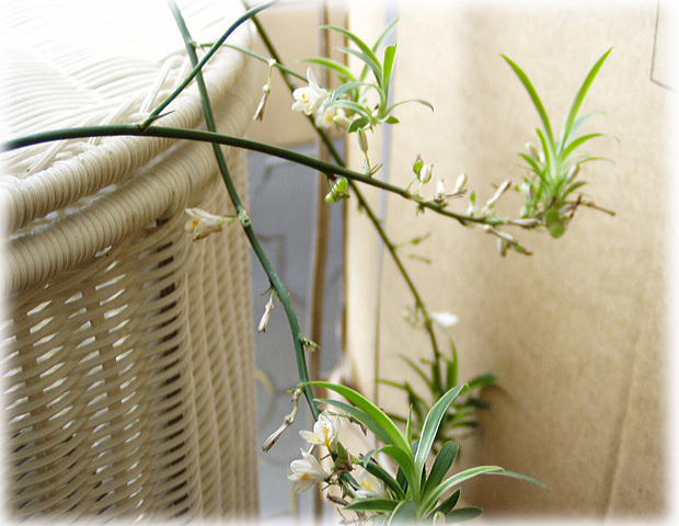 今年は初めて花芽を付けた観葉植物がたくさん自分でもびっくりです愛情を持って育てているからかなぁ~倉庫で育てているオリヅルランです。毎日次々と花が咲いています。花は一日で終わってしまいます。全体の画像です。前に載せた時よりワイルドになってます。こちらも倉庫のテーブルヤシです。花芽が出て3ヶ月ぐらい経ちますがまだ咲きません。自宅のサンセベリアです。3日ぐらい前に花芽が伸びているのに気が付きました。蘭みたいに蜜みたいのが付いています。どんな花が咲くか楽しみですこちらはベランダのワイヤープランツです。気が付いたらプツプツと蕾が付いていました。調べてみたら、日にちが経つと皮がはじけ破れてゼリー状の甘い実が出てくるそうです。