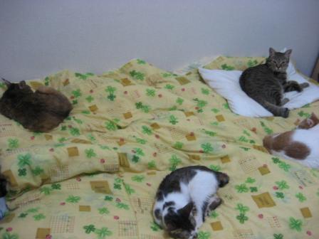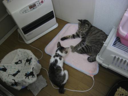 キョロの部屋の住人(住猫)が寒くないように石油ファンヒーターを使ってます。ハナちゃんは小さなホットカーペットも使ってます。「ハナちゃん、まろにホットカーペットを取られる」の図キョロの部屋、北向きなので凄く寒いんです><だからそれぐらいしてちょうどいいのですが、空気は乾燥してるし火事が心配です。ちなみにうちには加湿器が無いので乾燥を少しでも防ぐためにタオルをビチョビチョにしてバケツにかけて置くようにしています。キョロが1匹だけだったときは私はキョロが寂しくないようにキョロの部屋で一緒に寝て居たのですが、最近は私のベッドの上にキョロ、プチ、まろ、ハナちゃんが寝て居るときもあって、猫たちにどいてもらうのも気がひけるので、そんな夜は居間のこたつで寝てます。キョロとプチ。今時の石油ファンヒーターは安全のため3時間で自動消火になっているので少し安心ですが、寝る前、それから真夜中にも大丈夫か点検します。自動消火後も寒くないよう、湯たんぽも入れてます。真夜中にそっとキョロの部屋をのぞくと、キョロの部屋の住人(住猫)は寒さを感じることなくぐっすりと眠ってます。真っ暗な部屋で猫たちの安心しきった寝姿を見るととても嬉しいです。それと同時にお外の猫たちのことを思うと「寒いよね、助けられなくてごめんね」と申し訳ない気持ちになります。お外は寒い、すごく寒い。私が今「外で寝ろ」と言われたら絶対に寝れません。暖かい場所で寝られる、夏は涼しい場所で寝られる、それってとても幸せなことだといつも痛感します。でも野良猫たちは寒さに身を縮めながら耐えて過ごすしかないのです。。。私よりもはるかに小さな生き物にそんな辛い思いをさせたくない、と常に思っていますが、私の出来ることは少ないです。はてさて?この小さな姫はいつ元気になってくれるのでしょう???姫は明日もまた通院です。~ランキング参加中~にほんブログ村