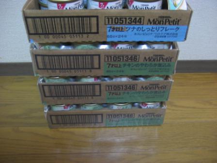モンプチ缶を約100缶購入しました!数ヶ月前、近所にペット専門のホームセンターがOPENしたのですが、そこでモンプチ缶が1缶38円!!!我が家には10匹の猫が居て好みもそれぞれですが、やはりモンプチは不動の人気です^^もちろん安売りの種類は限定されていて7歳以上の猫ちゃん対象の缶詰め2種類のみ。我が家にはもうすぐ20歳になるみいちゃんも居るし、口内炎がひどいキョロも居ます。キョロも多分7歳ぐらいにはなっていることでしょう。それにみいちゃんはもう歯がありません^^;キョロは口の中が痛くなってくるとドライフードを食べられなくなってしまいます。だから7歳以上対象でスープ状に近い柔らかいフードは欠かせません。1缶38円でも総合栄養食です!キャットフードやペットシーツ猫砂などは専らネットで購入していますが、たまには住んでいる街で安くてお買い得なものを探してみるのもいいですね☆~ご報告~多大な時間と体力とお金を使って保護活動に尽力されているリアンドクシネ様からたくさんのご寄付をいただきました。いただいたご寄付は全て不遇な猫たちの医療費に充てさせていただきます。決して無駄にはいたしません。(※先に書いたモンプチ缶はもちろん自分のお財布から購入しています。ご寄付は不遇な猫たちのために使います。)リアンドクシネ様、本当にありがとうございました!心から感謝いたします。助けなければならない猫たちがお外にはたくさん居ます。それには我が家の保護猫たちのことを幸せな家庭に送り出すしか有りません。現在5畳弱の部屋に猫が6匹居る状況です。居間には4匹の猫と犬が1匹居ます。それぞれの子に話しかけ頭を撫でフードを管理しトイレも清潔に保ち時間が有る限り触れ合っていますが、私ひとり対11匹。私の手は2本しかなく、右手でまろを撫でながら左手でキョロを構い、顔をケージにくっつけてケージの中のチョコと会話をしています。全ての子に均等に愛情を注ぐように心がけています。でもみんな「もっと!もっと!」と愛情を求めてきます。保護猫たちが寂しい思いをしないよう、いつも幸せに包まれて暮らせるよう、これからも里親さまを探していきます。トップページに我が家の保護猫たちの里親募集記事を掲載しています。どうぞよろしくお願いいたします。~ランキング参加中~にほんブログ村