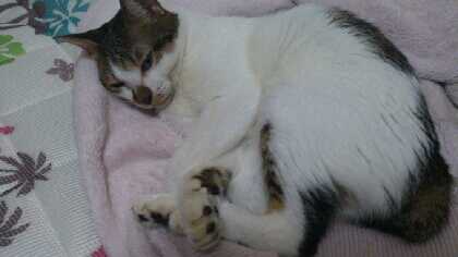 みいちゃんはもう動けません。おしっこも寝たまま漏らします。きのう、病院で大きな注射器と栄養補給剤をもらってきました。a/dを水で溶いてシリンジで少しずつ、ほんとに少し。あげすぎるとむせるから。みいちゃんの首元がかすかに動いていることで、いのちを確認しています。