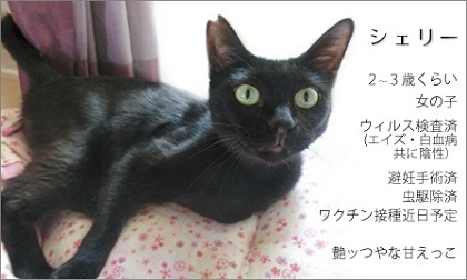 今夜は眠れそうもない。。。でもきっと寝ちゃうんだろうな^^;疲れてるし。明日から犬猫たちと離れ離れの生活です。嫌だ、離れたくない、嫌だ><でもペットシッターさんにも念入りにお願いしたし(今日も電話してくどいほど説明してしまいました^^;)、もう明日からの入院は決まっているのだから腹を決めました。手術をして、さっぱりと帰って来たいと思いまっす☆さて!美しい黒猫シェリーの募集記事が「いつでも里親募集中」に掲載されました!!シェリーを預かってくださっているうららさんが掲載してくださいました。うららさん、ありがとうございます!そしてそして、いつもバナーなどでお世話になっているひこさんがシェリーのバナーを作ってくださいました☆バナーをクリックすると「いつでも里親募集中」のページに移動します。シェリーのことや募集に関する詳細が掲載されていますので、是非ぜひバナーをクリックしてみてください☆それにしてもシェリーはため息が出るほど可愛いねぇ。。。しかも性格は甘ったれで満点だし、毛艶も最高。黒猫に魅かれているそこのあなた、シェリーに会ってみませんか???シェリーは心優しき里親様を募集しています。どうぞよろしくお願いいたします☆↓ ↓ ↓私の入院中も我が家の保護猫たちは心優しき里親様を募集しています☆節電節約募金~ランキング参加中~にほんブログ村~☆我が家の『幸せになり隊』が優しいご家族を待っています☆~『幸せになり隊』メンバーへのお問い合わせはこちらまで!nekoneko7123@yahoo.co.jpバナー製作☆(ひこさん、ありがとう☆)