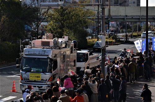 鶴見1区から2区へタスキが渡って200メートルぐらいでしょうか?この時は行きの区間だから、あまり差は付いていませんでした。まだ朝9時だというのに、沿道は人だらけ!まあ、僕を含めて暇人多いなあ!鶴見川の橋の上ですが、この15号線は橋のデザインされていないので普通の道路にしか見えません。