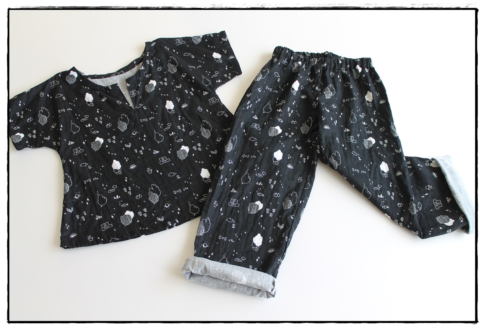 寝苦しい夜が 続いていますね。可愛らしい生地を見つけたので10才の娘に パジャマを作りました。生地の卸専門店 布もようさんの「あのね」 というダブルガーゼです。黒地の パジャマって 暑苦しいイメージがしたけれど作ってみたら 以外に涼しげでした。生地裏が白いからズボンの裾を折ると さらに 可愛らしい。手描き風の イラストが いいんです ↓↓↓ トップスは 衿付け(えりつけ)、ボタン付け、袖付け(そでつけ)のないとても簡単な ブラウスです。パンツは そのまま はくと ユニクロのリラコ風でい~い シルエットです。娘も 「めっちゃ かわいい! めっちゃ はきやすい!」と喜んでくれました。● 使用した生地布もよう 「あのね」ブラック 販売価格(税込): (10cm)41円 ● 使用した型紙【送料無料】おんなのこの服、てづくりの服 [ 月居良子 ] ブラウス+八分丈パンツ 100~140サイズのお洋服が作れます。
