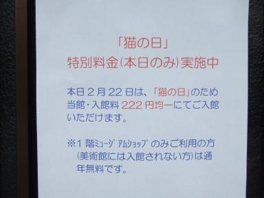 本日2月22日(日)は“猫の日” そこで猫の家(湘南ねこ美術館)[=猫美]では、“猫の日”イベントとして本日に限り入館料を222円均一にして、ご来館していただいたお客様に館内を見学していただきました。 今回のイベントは先日2/13付で発行された“はまかぜ新聞”にも掲載されていたので、新聞をご覧いただいてご来館してくださったお客様も多数いらっしゃいました♪ 今回は開館日と“猫の日”が重なったためこのイベントの開催を決めましたが、大変好評でしたので、来年以降もまた“猫の日”と開館日が重なった際には同じようなイベントを企画して行きたいと思います。 その際にはまたぜひご来館下さい。 《“猫の日”にちなんで開催した入館料222円均一の貼紙》 猫の家(湘南ねこ美術館)ご案内猫の家(湘南ねこ美術館)=通称:猫美は、猫の絵と雑貨と本に囲まれた空間で、ご来館いただいたお客様方に少しでも癒しを感じていただければと思い、今にも猫が出てきそうな雰囲気のある昭和30年代の民家をリフォームして2007年4月にオープンした個人美術館です。館内には常時50点以上の美術館所蔵の猫の絵を展示している常設展示室、猫の絵本を中心に850冊を超える蔵書を落ち着いた雰囲気の中で自由にご覧になれる図書ルーム、一定期間様々な作家さんたちに猫の作品を出品していただき公開している特別展示室があるほか、美術館の1階には珍しい猫雑貨や作家さんたちのオリジナルグッズや作品などを販売しているミュジアムショップも併設しています。《親子連れでも楽しめる猫美・常設展示室の様子》《美術館のオープニングで看板を描く画家の渡辺あきおさん》《美術館の入口》◎1/10(土)~3/30(月)まで、2階特別展示室では「渡辺あきお特別展」を開催します◎温かみのある可愛い猫たちの絵で知られる人気画家、渡辺あきおさんが描いた代表作を含む猫の原画と版画を展示致しますので、ぜひご来館下さい。《「渡辺あきお特別展」の案内状》猫の家(湘南ねこ美術館)神奈川県三浦郡葉山町下山口1502電話:046-876-3468(開館日) 毎週土・日・月曜日 午前10~午後5時まで(入館は午後4時半まで) ※2月の開館日...1,2,7,8,9,14,15,16,21,22,23,28 3月の開館日...1,2,7,8,9,14,15,16,21,22,23,28,29,30 (3/30まで特別展示室では「渡辺あきお特別展」を開催中)(入館料) 大人350円,小中学生250円,シルバー(65才以上)300円,障害者手帳をお持ちの方300円(ご来館のアクセス)[電車・バスをご利用の場合]◎JR横須賀線「逗子駅」東口下車。駅前バスターミナルより 京急バス2番のりば...横須賀市民病院行き、長井行きなど全便乗車可。(約10分間隔) 京急バス3番のりば...海岸廻り葉山行き。(約10分間隔)◎京浜急行線「新逗子駅」南口下車。新逗子駅バス停より 京急バス1番のりば...横須賀市民病院行き、長井行きなど全便乗車可。(約10分間隔) 京急バス2番のりば...海岸廻り葉山行き。(約10分間隔)上記にて、京急バス「葉山」バス停下車。進行方向に徒歩約2分。[お車にてご来館の場合]当館は、葉山御用邸・葉山警察そばの国道134号線、道路沿いにございます。都心方面や遠隔地からお越しの方は、横浜横須賀道路の逗子インターか葉山・横須賀インターで降りてから、まずは葉山御用邸を目指していらっしゃって下さい。横浜・逗子方面からの場合は葉山御用邸を過ぎてすぐの短い坂道を登りきったところの左手に。逆に三崎・城ヶ島方面からの場合は長者ヶ崎の先にある葉山公園入口の信号の少し先の右手にございます。※駐車場:なし*近隣駐車場のご案内* 1.葉山公園(美術館より徒歩約3分)に30台の県営駐車場があります。 (4月~11月を除き無料) 4/1~ 6/30...土日祝:1日1回500円,平日:無料。 7/1~ 8/31...土日祝:1日1回2,000円,平日:1日1回1,500円。 9/1~11/30...土日祝:1日1回500円,平日:無料。 12/1~3/31...無料。 2.長者ヶ崎(美術館より徒歩約5分)に葉山町の町営駐車場と県営駐車場があります。 町営駐車場 (7月・8月を除き無料) 9/1~ 3/31...無料。 7/1~ 8/31...土日祝:1日1回2,000円,平日:1日1回1,500円。 県営駐車場 (有料) 通年...土日祝:1時間400円,平日:1時間300円。《"猫の家"近隣案内図》