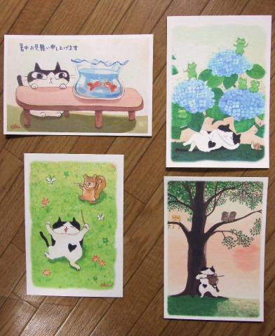 猫の家(湘南ねこ美術館)[=猫美]のミュージアムショップに新しく布施和佳子さんのポストカードが入りました! 今回のポストカードは、今まで布施さんが描いてこられたタイプのアクリル絵の具を使って描かれた絵とは違い、布施さんがパソコンを使って描いたイラストのポストカード。 これまでの布施さんの絵とはまたひと味違った趣が出ています♪ このポストカードは、昨日ラジオ出演で布施さんとご一緒した際にお預かりしたもので、この週末から猫美のミュージアムショップに置いてあります。 価格は1枚210円で、8種類の柄があります。 布施さんファンの方は、ぜひ種類の揃っているうちにご来館下さい。 なお、猫美のミュージアムショップは無料にてご利用になれます。(美術館拝観の場合には別途、入館料が必要となります) 《新しく加わった可愛い布施さんのポストカード》 猫の家(湘南ねこ美術館)ご案内猫の家(湘南ねこ美術館)=通称:猫美は、猫の絵と雑貨と本に囲まれた空間で、ご来館いただいたお客様方に少しでも癒しを感じていただければと思い、今にも猫が出てきそうな雰囲気のある昭和30年代の民家をリフォームして2007年4月にオープンした個人美術館です。館内には常時50点以上の美術館所蔵の猫の絵を展示している常設展示室、猫の絵本を中心に850冊を超える蔵書を落ち着いた雰囲気の中で自由にご覧になれる図書ルーム、一定期間様々な作家さんたちに猫の作品を出品していただき公開している特別展示室があるほか、美術館の1階には珍しい猫雑貨や作家さんたちのオリジナルグッズや作品などを販売しているミュジアムショップも併設しています。《親子連れでも楽しめる猫美・常設展示室の様子》 《美術館の入口》◎5/30(土)~8/31(月)までは、猫美の特別展示室で「猫からの暑中見舞い 残暑見舞い展」を開催。13人の作家さんの23点の原画を展示。 《「猫からの暑中見舞い 残暑見舞い展」を開催中の特別展示室》猫の家(湘南ねこ美術館)神奈川県三浦郡葉山町下山口1502電話:046-876-3468(開館日) 毎週土・日・月曜日 午前10~午後5時まで(入館は午後4時半まで) ※6月の開館日...1,6,7,8,13,14,15,20,21,22,27,28,29 7月の開館日...4,5,6,11,12,13,18,19,20,25,26,27 (入館料) 大人350円,小中学生250円,シルバー(65才以上)300円,障害者手帳をお持ちの方300円(ご来館のアクセス)[電車・バスをご利用の場合]◎JR横須賀線「逗子駅」東口下車。駅前バスターミナルより 京急バス2番のりば...横須賀市民病院行き、長井行きなど全便乗車可。(約10分間隔) 京急バス3番のりば...海岸廻り葉山行き。(約10分間隔)◎京浜急行線「新逗子駅」南口下車。新逗子駅バス停より 京急バス1番のりば...横須賀市民病院行き、長井行きなど全便乗車可。(約10分間隔) 京急バス2番のりば...海岸廻り葉山行き。(約10分間隔)上記にて、京急バス「葉山」バス停下車。進行方向に徒歩約2分。[お車にてご来館の場合]当館は、葉山御用邸・葉山警察そばの国道134号線、道路沿いにございます。都心方面や遠隔地からお越しの方は、横浜横須賀道路の逗子インターか葉山・横須賀インターで降りてから、まずは葉山御用邸を目指していらっしゃって下さい。横浜・逗子方面からの場合は葉山御用邸を過ぎてすぐの短い坂道を登りきったところの左手に。逆に三崎・城ヶ島方面からの場合は長者ヶ崎の先にある葉山公園入口の信号の少し先の右手にございます。※駐車場:なし*近隣駐車場のご案内* 1.葉山公園(美術館より徒歩約3分)に30台の県営駐車場があります。 (4月~11月を除き無料) 4/1~ 6/30...土日祝:1日1回500円,平日:無料。 7/1~ 8/31...土日祝:1日1回2,000円,平日:1日1回1,500円。 9/1~11/30...土日祝:1日1回500円,平日:無料。 12/1~3/31...無料。 2.長者ヶ崎(美術館より徒歩約5分)に葉山町の町営駐車場と県営駐車場があります。 町営駐車場 (7月・8月を除き無料) 9/1~ 3/31...無料。 7/1~ 8/31...土日祝:1日1回2,000円,平日:1日1回1,500円。 県営駐車場 (有料) 通年...土日祝:1時間400円,平日:1時間300円。《"猫の家"近隣案内図》