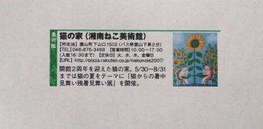 5/30より猫の家(湘南ねこ美術館)[=猫美]で開催中の「猫からの暑中見舞い 残暑見舞い展」についての記事が本日(6/30)付の神奈川新聞に掲載されました♪ 《6/30付の神奈川新聞の表紙》 掲載されたのは、神奈川新聞13面の情報ページ“iバザール”で、ちょうど中央付近の目立つ場所に掲載されました。 《「猫からの暑中見舞い 残暑見舞い展」の記事が掲載された神奈川新聞の“iバザール”》 《神奈川新聞の"iバザール"で紹介された「猫からの暑中見舞い 残暑見舞い展」の記事》 記事には「猫からの暑中見舞い 残暑見舞い展」の案内状と同じ布施和佳子さんが」描いた“ひまわり”の絵も一緒に掲載されている他、猫美のミュージアムショップについても触れられていて、とても素敵な記事になっています。 猫の家(湘南ねこ美術館)ご案内猫の家(湘南ねこ美術館)=通称:猫美は、猫の絵と雑貨と本に囲まれた空間で、ご来館いただいたお客様方に少しでも癒しを感じていただければと思い、今にも猫が出てきそうな雰囲気のある昭和30年代の民家をリフォームして2007年4月にオープンした個人美術館です。館内には常時50点以上の美術館所蔵の猫の絵を展示している常設展示室、猫の絵本を中心に850冊を超える蔵書を落ち着いた雰囲気の中で自由にご覧になれる図書ルーム、一定期間様々な作家さんたちに猫の作品を出品していただき公開している特別展示室があるほか、美術館の1階には珍しい猫雑貨や作家さんたちのオリジナルグッズや作品などを販売しているミュジアムショップも併設しています。《親子連れでも楽しめる猫美・常設展示室の様子》 《美術館の入口》◎5/30(土)~8/31(月)までは、猫美の特別展示室で「猫からの暑中見舞い 残暑見舞い展」を開催。13人の作家さんの23点の原画を展示。 《「猫からの暑中見舞い 残暑見舞い展」を開催中の特別展示室》猫の家(湘南ねこ美術館)神奈川県三浦郡葉山町下山口1502電話:046-876-3468(開館日) 毎週土・日・月曜日 午前10~午後5時まで(入館は午後4時半まで) ※6月の開館日...1,6,7,8,13,14,15,20,21,22,27,28,29 7月の開館日...4,5,6,11,12,13,18,19,20,25,26,27 8月の開館日...1,2,3,8,9,10,15,16,17,22,23,24,29,30,31 (入館料) 大人350円,小中学生250円,シルバー(65才以上)300円,障害者手帳をお持ちの方300円(ご来館のアクセス)[電車・バスをご利用の場合]◎JR横須賀線「逗子駅」東口下車。駅前バスターミナルより 京急バス2番のりば...横須賀市民病院行き、長井行きなど全便乗車可。(約10分間隔) 京急バス3番のりば...海岸廻り葉山行き。(約10分間隔)◎京浜急行線「新逗子駅」南口下車。新逗子駅バス停より 京急バス1番のりば...横須賀市民病院行き、長井行きなど全便乗車可。(約10分間隔) 京急バス2番のりば...海岸廻り葉山行き。(約10分間隔)上記にて、京急バス「葉山」バス停下車。進行方向に徒歩約2分。[お車にてご来館の場合]当館は、葉山御用邸・葉山警察そばの国道134号線、道路沿いにございます。都心方面や遠隔地からお越しの方は、横浜横須賀道路の逗子インターか葉山・横須賀インターで降りてから、まずは葉山御用邸を目指していらっしゃって下さい。横浜・逗子方面からの場合は葉山御用邸を過ぎてすぐの短い坂道を登りきったところの左手に。逆に三崎・城ヶ島方面からの場合は長者ヶ崎の先にある葉山公園入口の信号の少し先の右手にございます。※駐車場:なし*近隣駐車場のご案内* 1.葉山公園(美術館より徒歩約3分)に30台の県営駐車場があります。 (4月~11月を除き無料) 4/1~ 6/30...土日祝:1日1回500円,平日:無料。 7/1~ 8/31...土日祝:1日1回2,000円,平日:1日1回1,500円。 9/1~11/30...土日祝:1日1回500円,平日:無料。 12/1~3/31...無料。 2.長者ヶ崎(美術館より徒歩約5分)に葉山町の町営駐車場と県営駐車場があります。 町営駐車場 (7月・8月を除き無料) 9/1~ 3/31...無料。 7/1~ 8/31...土日祝:1日1回2,000円,平日:1日1回1,500円。 県営駐車場 (有料) 通年...土日祝:1時間400円,平日:1時間300円。《"猫の家"近隣案内図》