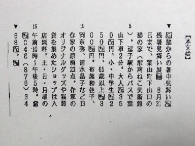 現在、猫の家(湘南ねこ美術館)[=猫美]で開催中の「猫からの暑中見舞い 残暑見舞い展」についての記事が明日(6/30)の神奈川新聞に掲載されることになりました♪ 掲載されるのは、神奈川新聞の“iバザール”という情報のコーナー。 皆さんも宜しかったら是非ご覧になってみて下さい。 《先日、新聞社からFAXされた今回の記事の原稿》 猫の家(湘南ねこ美術館)ご案内猫の家(湘南ねこ美術館)=通称:猫美は、猫の絵と雑貨と本に囲まれた空間で、ご来館いただいたお客様方に少しでも癒しを感じていただければと思い、今にも猫が出てきそうな雰囲気のある昭和30年代の民家をリフォームして2007年4月にオープンした個人美術館です。館内には常時50点以上の美術館所蔵の猫の絵を展示している常設展示室、猫の絵本を中心に850冊を超える蔵書を落ち着いた雰囲気の中で自由にご覧になれる図書ルーム、一定期間様々な作家さんたちに猫の作品を出品していただき公開している特別展示室があるほか、美術館の1階には珍しい猫雑貨や作家さんたちのオリジナルグッズや作品などを販売しているミュジアムショップも併設しています。《親子連れでも楽しめる猫美・常設展示室の様子》 《美術館の入口》◎5/30(土)~8/31(月)までは、猫美の特別展示室で「猫からの暑中見舞い 残暑見舞い展」を開催。13人の作家さんの23点の原画を展示。 《「猫からの暑中見舞い 残暑見舞い展」を開催中の特別展示室》猫の家(湘南ねこ美術館)神奈川県三浦郡葉山町下山口1502電話:046-876-3468(開館日) 毎週土・日・月曜日 午前10~午後5時まで(入館は午後4時半まで) ※6月の開館日...1,6,7,8,13,14,15,20,21,22,27,28,29 7月の開館日...4,5,6,11,12,13,18,19,20,25,26,27 8月の開館日...1,2,3,8,9,10,15,16,17,22,23,24,29,30,31 (入館料) 大人350円,小中学生250円,シルバー(65才以上)300円,障害者手帳をお持ちの方300円(ご来館のアクセス)[電車・バスをご利用の場合]◎JR横須賀線「逗子駅」東口下車。駅前バスターミナルより 京急バス2番のりば...横須賀市民病院行き、長井行きなど全便乗車可。(約10分間隔) 京急バス3番のりば...海岸廻り葉山行き。(約10分間隔)◎京浜急行線「新逗子駅」南口下車。新逗子駅バス停より 京急バス1番のりば...横須賀市民病院行き、長井行きなど全便乗車可。(約10分間隔) 京急バス2番のりば...海岸廻り葉山行き。(約10分間隔)上記にて、京急バス「葉山」バス停下車。進行方向に徒歩約2分。[お車にてご来館の場合]当館は、葉山御用邸・葉山警察そばの国道134号線、道路沿いにございます。都心方面や遠隔地からお越しの方は、横浜横須賀道路の逗子インターか葉山・横須賀インターで降りてから、まずは葉山御用邸を目指していらっしゃって下さい。横浜・逗子方面からの場合は葉山御用邸を過ぎてすぐの短い坂道を登りきったところの左手に。逆に三崎・城ヶ島方面からの場合は長者ヶ崎の先にある葉山公園入口の信号の少し先の右手にございます。※駐車場:なし*近隣駐車場のご案内* 1.葉山公園(美術館より徒歩約3分)に30台の県営駐車場があります。 (4月~11月を除き無料) 4/1~ 6/30...土日祝:1日1回500円,平日:無料。 7/1~ 8/31...土日祝:1日1回2,000円,平日:1日1回1,500円。 9/1~11/30...土日祝:1日1回500円,平日:無料。 12/1~3/31...無料。 2.長者ヶ崎(美術館より徒歩約5分)に葉山町の町営駐車場と県営駐車場があります。 町営駐車場 (7月・8月を除き無料) 9/1~ 3/31...無料。 7/1~ 8/31...土日祝:1日1回2,000円,平日:1日1回1,500円。 県営駐車場 (有料) 通年...土日祝:1時間400円,平日:1時間300円。《"猫の家"近隣案内図》