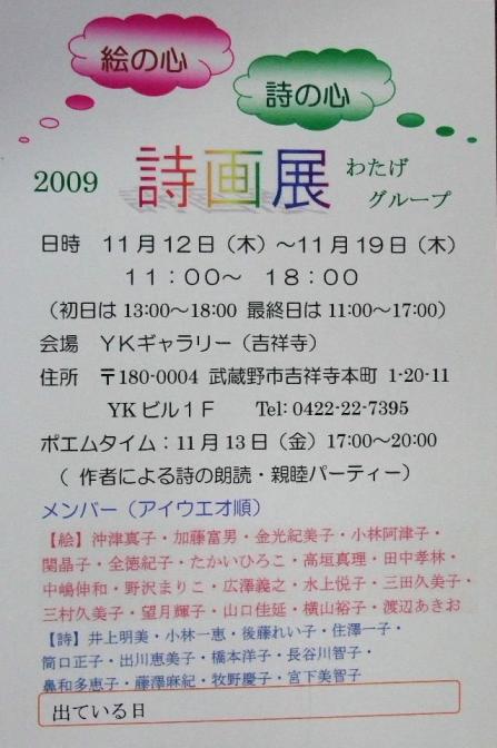 今日は、11/12(木)から吉祥寺のYKギャラリーで開催されていた“2009詩画展”の最終日だったので、出品作品の搬出に行ってきました。 少し早めにギャラリーに到着して、既にギャラリーに到着していらっしゃった作家さんたちと談笑しながら一息ついた後、渡辺あきおさんや高垣真理さんたちと一緒にクロージングパーティーの買出しへ…。 ビールや解禁になったばかりのボジョレーヌーボーと惣菜類を買って来て17時頃からギャラリーで打ち上げを兼ねたクロージングパーティーをやりました。 “詩画展”は毎年アットホームな雰囲気の中で行われているので、搬出に来た作家さんは勿論、来場されていたお客様も交えてしばしの間歓談。 20時近くまで楽しいひとときを過ごしながら搬出をして帰って来ました。 私の作品は、今回出品した作品のうち1点が京都の方に旅立って行くことになりました。 《“2009詩画展”で展示されている私の作品》 会期中は美術館もあることから、限られた時間しかギャラリーには行かれませんでしたが、この場をお借りしてご来場していただいたお客様に心よりお礼申し上げます。 猫の家(湘南ねこ美術館)ご案内猫の家(湘南ねこ美術館)=通称:猫美は、猫の絵と雑貨と本に囲まれた空間で、ご来館いただいたお客様方に少しでも癒しを感じていただければと思い、今にも猫が出てきそうな雰囲気のある昭和30年代の民家をリフォームして2007年4月にオープンした個人美術館です。館内には常時50点以上の美術館所蔵の猫の絵を展示している常設展示室、猫の絵本を中心に850冊を超える蔵書を落ち着いた雰囲気の中で自由にご覧になれる図書ルーム、一定期間様々な作家さんたちに猫の作品を出品していただき公開している特別展示室があるほか、美術館の1階には珍しい猫雑貨や作家さんたちのオリジナルグッズや作品などを販売しているミュジアムショップも併設しています。《親子連れでも楽しめる猫美・常設展示室の様子》 《美術館の入口》 ◎11/7(土)~12/28(月)までは、毎年大好評をいただいている「ねこたちのクリスマス展」の第3弾!「ねこたちのクリスマス展3」を開催。今年は16人の作家さんによる原画23枚を展示。合わせて常設展示室に於いてもクリスマスにちなんだ絵・本・雑貨を多数展示致します。 《「ねこたちのクリスマス展3」の案内状》 猫の家(湘南ねこ美術館)神奈川県三浦郡葉山町下山口1502電話:046-876-3468(開館日) 毎週土・日・月曜日 午前10~午後5時まで(入館は午後4時半まで) ※11月の開館日...1,2,7,8,9,14,15,16,21,22,23,28,29,30 12月の開館日...5,6,7,12,13,14,19,20,21,26,27,28 (入館料)大人350円,小中学生250円,シルバー(65才以上)300円,障害者手帳をお持ちの方300円(ご来館のアクセス)[電車・バスをご利用の場合]◎JR横須賀線「逗子駅」東口下車。駅前バスターミナルより 京急バス2番のりば...横須賀市民病院行き、長井行きなど全便乗車可。(約10分間隔) 京急バス3番のりば...海岸廻り葉山行き。(約10分間隔)◎京浜急行線「新逗子駅」南口下車。新逗子駅バス停より 京急バス1番のりば...横須賀市民病院行き、長井行きなど全便乗車可。(約10分間隔) 京急バス2番のりば...海岸廻り葉山行き。(約10分間隔)上記にて、京急バス「葉山」バス停下車。進行方向に徒歩約2分。[お車にてご来館の場合]当館は、葉山御用邸・葉山警察そばの国道134号線、道路沿いにございます。都心方面や遠隔地からお越しの方は、横浜横須賀道路の逗子インターか葉山・横須賀インターで降りてから、まずは葉山御用邸を目指していらっしゃって下さい。横浜・逗子方面からの場合は葉山御用邸を過ぎてすぐの短い坂道を登りきったところの左手に。逆に三崎・城ヶ島方面からの場合は長者ヶ崎の先にある葉山公園入口の信号の少し先の右手にございます。※駐車場:なし*近隣駐車場のご案内* 1.葉山公園(美術館より徒歩約3分)に30台の県営駐車場があります。 (4月~11月を除き無料) 4/1~ 6/30...土日祝:1日1回500円,平日:無料。 7/1~ 8/31...土日祝:1日1回2,000円,平日:1日1回1,500円。 9/1~11/30...土日祝:1日1回500円,平日:無料。 12/1~3/31...無料。 2.長者ヶ崎(美術館より徒歩約5分)に葉山町の町営駐車場と県営駐車場があります。 町営駐車場 (7月・8月を除き無料) 9/1~ 3/31...無料。 7/1~ 8/31...土日祝:1日1回2,000円,平日:1日1回1,500円。 県営駐車場 (有料) 通年...土日祝:1時間400円,平日:1時間300円。《"猫の家"近隣案内図》