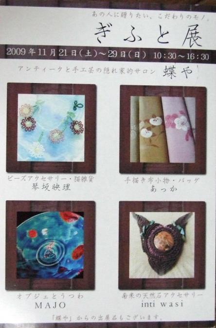 先週のことですが、昨日(11/29)まで鎌倉の小町にあるアンティークと手工芸の隠れ家的サロン“蝶や”で開催されていた“ぎふと展”を見に行って来ました。 この“ぎふと展”にはいつも可愛い猫のイラストを描いていらっしゃる琴坂映理さんが作品を出品されていて、今回案内状をいただいたので行って来ました。 会場では4人の作家さんの作品が展示されていて、琴坂さんはアクセサリーと共に猫の星座表などの猫グッズとオリジナルの原画も販売されていました。 その中で会場に入ったとたん作品と目があった琴坂さんのオリジナルのミニ額原画“星に願いを”をいただいて帰って来ました♪ この琴坂さんの“星に願いを”はこれからの時期にもピッタリの絵だったので、早速今度の週末あたりから展示室の方で飾らせていただこうかと思っています。 《琴坂さんからいただいた“ぎふと展”の案内状》 猫の家(湘南ねこ美術館)ご案内猫の家(湘南ねこ美術館)=通称:猫美は、猫の絵と雑貨と本に囲まれた空間で、ご来館いただいたお客様方に少しでも癒しを感じていただければと思い、今にも猫が出てきそうな雰囲気のある昭和30年代の民家をリフォームして2007年4月にオープンした個人美術館です。館内には常時50点以上の美術館所蔵の猫の絵を展示している常設展示室、猫の絵本を中心に850冊を超える蔵書を落ち着いた雰囲気の中で自由にご覧になれる図書ルーム、一定期間様々な作家さんたちに猫の作品を出品していただき公開している特別展示室があるほか、美術館の1階には珍しい猫雑貨や作家さんたちのオリジナルグッズや作品などを販売しているミュジアムショップも併設しています。《親子連れでも楽しめる猫美・常設展示室の様子》 《美術館の入口》 ◎11/7(土)~12/28(月)までは、毎年大好評をいただいている「ねこたちのクリスマス展」の第3弾!「ねこたちのクリスマス展3」を開催。今年は16人の作家さんによる原画23枚を展示。合わせて常設展示室に於いてもクリスマスにちなんだ絵・本・雑貨を多数展示致します。 《「ねこたちのクリスマス展3」の案内状》 猫の家(湘南ねこ美術館)神奈川県三浦郡葉山町下山口1502電話:046-876-3468(開館日) 毎週土・日・月曜日 午前10~午後5時まで(入館は午後4時半まで) ※11月の開館日...1,2,7,8,9,14,15,16,21,22,23,28,29,30 12月の開館日...5,6,7,12,13,14,19,20,21,26,27,28 (入館料)大人350円,小中学生250円,シルバー(65才以上)300円,障害者手帳をお持ちの方300円(ご来館のアクセス)[電車・バスをご利用の場合]◎JR横須賀線「逗子駅」東口下車。駅前バスターミナルより 京急バス2番のりば...横須賀市民病院行き、長井行きなど全便乗車可。(約10分間隔) 京急バス3番のりば...海岸廻り葉山行き。(約10分間隔)◎京浜急行線「新逗子駅」南口下車。新逗子駅バス停より 京急バス1番のりば...横須賀市民病院行き、長井行きなど全便乗車可。(約10分間隔) 京急バス2番のりば...海岸廻り葉山行き。(約10分間隔)上記にて、京急バス「葉山」バス停下車。進行方向に徒歩約2分。[お車にてご来館の場合]当館は、葉山御用邸・葉山警察そばの国道134号線、道路沿いにございます。都心方面や遠隔地からお越しの方は、横浜横須賀道路の逗子インターか葉山・横須賀インターで降りてから、まずは葉山御用邸を目指していらっしゃって下さい。横浜・逗子方面からの場合は葉山御用邸を過ぎてすぐの短い坂道を登りきったところの左手に。逆に三崎・城ヶ島方面からの場合は長者ヶ崎の先にある葉山公園入口の信号の少し先の右手にございます。※駐車場:なし*近隣駐車場のご案内* 1.葉山公園(美術館より徒歩約3分)に30台の県営駐車場があります。 (4月~11月を除き無料) 4/1~ 6/30...土日祝:1日1回500円,平日:無料。 7/1~ 8/31...土日祝:1日1回2,000円,平日:1日1回1,500円。 9/1~11/30...土日祝:1日1回500円,平日:無料。 12/1~3/31...無料。 2.長者ヶ崎(美術館より徒歩約5分)に葉山町の町営駐車場と県営駐車場があります。 町営駐車場 (7月・8月を除き無料) 9/1~ 3/31...無料。 7/1~ 8/31...土日祝:1日1回2,000円,平日:1日1回1,500円。 県営駐車場 (有料) 通年...土日祝:1時間400円,平日:1時間300円。《"猫の家"近隣案内図》