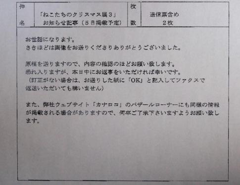昨日「深津あさみ・夢紡猫物語~猫のパステル画展~」が無事に終了し、この週末からはいよいよ毎年恒例の「ねこたちのクリスマス展」。 クリスマス展は毎年飾りつけで時間がかかるので昨日閉館後からさっそく準備を開始! 約一年ぶりになるクリスマスの雑貨たちと再会を楽しみながら飾りつけをしています。 そんな中、11/5(木)には今回の「ねこたちのクリスマス展3」についての記事が地元紙の神奈川新聞に掲載されることが決まりました! 今回の紙面では、案内状にもなっている多田すみえさんが描いてくださった“クリスマス子猫ちゃん”の絵がカラーで掲載されるそうなので、今から記事がとても楽しみです♪ 《11/5付の記事についての校正原稿の送付状(部分)》 猫の家(湘南ねこ美術館)ご案内猫の家(湘南ねこ美術館)=通称:猫美は、猫の絵と雑貨と本に囲まれた空間で、ご来館いただいたお客様方に少しでも癒しを感じていただければと思い、今にも猫が出てきそうな雰囲気のある昭和30年代の民家をリフォームして2007年4月にオープンした個人美術館です。館内には常時50点以上の美術館所蔵の猫の絵を展示している常設展示室、猫の絵本を中心に850冊を超える蔵書を落ち着いた雰囲気の中で自由にご覧になれる図書ルーム、一定期間様々な作家さんたちに猫の作品を出品していただき公開している特別展示室があるほか、美術館の1階には珍しい猫雑貨や作家さんたちのオリジナルグッズや作品などを販売しているミュジアムショップも併設しています。《親子連れでも楽しめる猫美・常設展示室の様子》 《美術館の入口》 ◎11/7(土)~12/28(月)までは、毎年大好評をいただいている「ねこたちのクリスマス展」の第3弾!「ねこたちのクリスマス展3」を開催。今年は16人の作家さんによる原画22枚(←ニャーニャーの語呂合わせ?)を展示。合わせて常設展示室に於いてもクリスマスにちなんだ絵・本・雑貨を多数展示致します。 《「ねこたちのクリスマス展3」の案内状》 猫の家(湘南ねこ美術館)神奈川県三浦郡葉山町下山口1502電話:046-876-3468(開館日) 毎週土・日・月曜日 午前10~午後5時まで(入館は午後4時半まで) ※11月の開館日...1,2,7,8,9,14,15,16,21,22,23,28,29,30 12月の開館日...5,6,7,12,13,14,19,20,21,26,27,28 (入館料)大人350円,小中学生250円,シルバー(65才以上)300円,障害者手帳をお持ちの方300円(ご来館のアクセス)[電車・バスをご利用の場合]◎JR横須賀線「逗子駅」東口下車。駅前バスターミナルより 京急バス2番のりば...横須賀市民病院行き、長井行きなど全便乗車可。(約10分間隔) 京急バス3番のりば...海岸廻り葉山行き。(約10分間隔)◎京浜急行線「新逗子駅」南口下車。新逗子駅バス停より 京急バス1番のりば...横須賀市民病院行き、長井行きなど全便乗車可。(約10分間隔) 京急バス2番のりば...海岸廻り葉山行き。(約10分間隔)上記にて、京急バス「葉山」バス停下車。進行方向に徒歩約2分。[お車にてご来館の場合]当館は、葉山御用邸・葉山警察そばの国道134号線、道路沿いにございます。都心方面や遠隔地からお越しの方は、横浜横須賀道路の逗子インターか葉山・横須賀インターで降りてから、まずは葉山御用邸を目指していらっしゃって下さい。横浜・逗子方面からの場合は葉山御用邸を過ぎてすぐの短い坂道を登りきったところの左手に。逆に三崎・城ヶ島方面からの場合は長者ヶ崎の先にある葉山公園入口の信号の少し先の右手にございます。※駐車場:なし*近隣駐車場のご案内* 1.葉山公園(美術館より徒歩約3分)に30台の県営駐車場があります。 (4月~11月を除き無料) 4/1~ 6/30...土日祝:1日1回500円,平日:無料。 7/1~ 8/31...土日祝:1日1回2,000円,平日:1日1回1,500円。 9/1~11/30...土日祝:1日1回500円,平日:無料。 12/1~3/31...無料。 2.長者ヶ崎(美術館より徒歩約5分)に葉山町の町営駐車場と県営駐車場があります。 町営駐車場 (7月・8月を除き無料) 9/1~ 3/31...無料。 7/1~ 8/31...土日祝:1日1回2,000円,平日:1日1回1,500円。 県営駐車場 (有料) 通年...土日祝:1時間400円,平日:1時間300円。《"猫の家"近隣案内図》