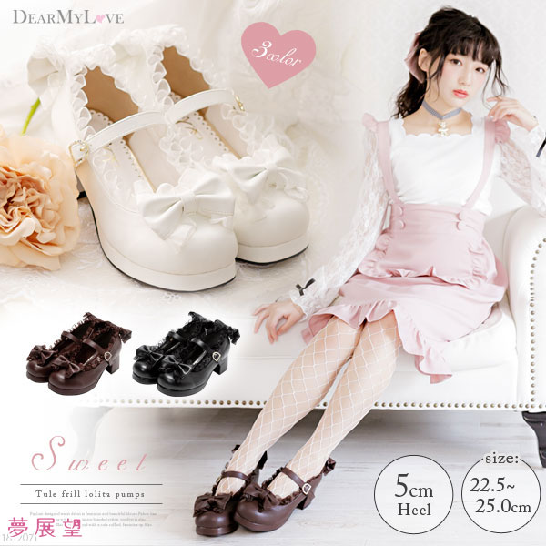 パンプス Sweet チュール ロリータ レース リボン 太ヒール ストライプ 合成皮革 痛くない 疲れにくい ブラック ホワイト ブラウン 黒 白 22.5cm 23cm 23.5cm 24cm 24.5cm 25cm レディース 夢展望◆入荷済