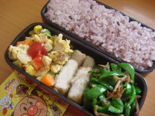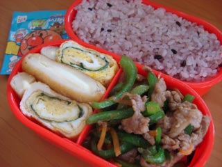 ・豚肉とピーマン炒め・大葉巻き卵焼き・じゃがいももち先日入れ忘れたあんぱんまんふりかけ、今日はちゃんと入れました。