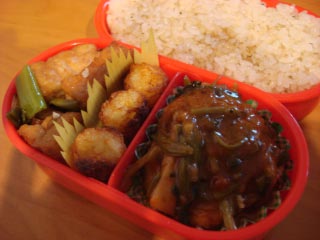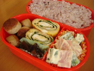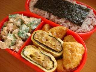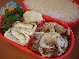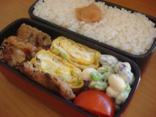 ・ねぎ入り卵焼き・ビーンズサラダ・長いも団子・プチトマト・豚肉のマスタードマヨネーズ炒めいつも主役になる豚肉炒めは、ちょっと焦がしてしまったので隅に詰め込ませています。長いも団子おいしいです。はい、これも生協のお世話になりました。我が家のベランダ菜園のプチトマトはまだ赤い実をつけてくれます。