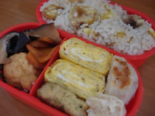 ・栗ご飯・じゃこたっぷり卵焼き・魚河岸揚げと野菜の煮物・えび饅頭・チキンナゲット今日はもりだくさん、冷蔵庫の中の中途半端ものみんななくなれ。